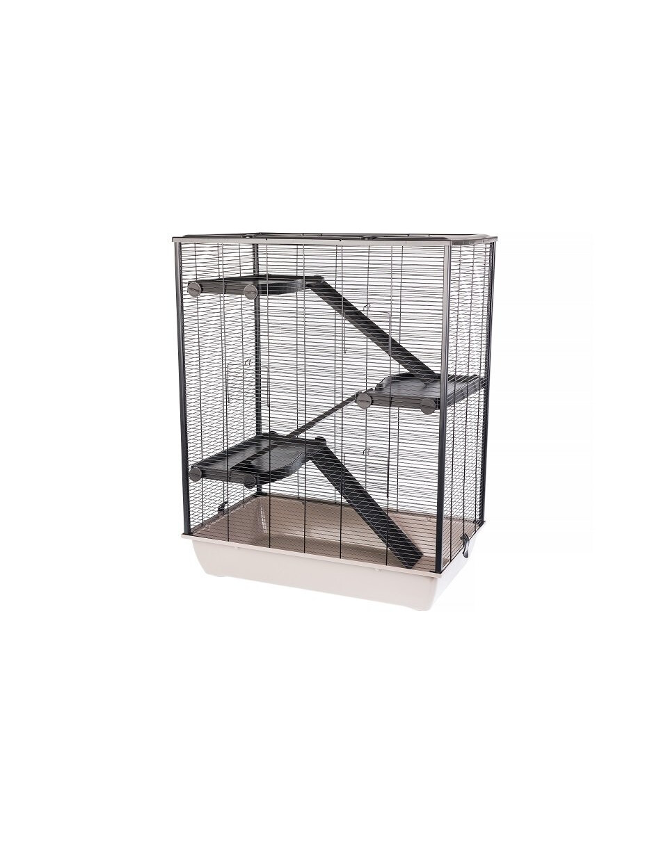 Veľmi priestranná klietka prispôsobená potrebám malých zvierat. Tri úrovne prepojené rebríkmi umožňujú hlodavcom bezpečný pohyb. Podlahy a rebríky sa ľahko montujú, sú robustné a rýchlo sa čistia. Klietka má hlboký plastový zásobník na podstielku, ktorý zabraňuje úniku pilín a odpadu mimo klietky.
