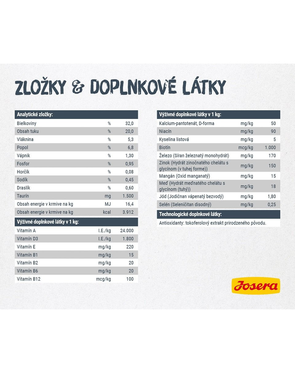 hrubý proteín 32,0 %, hrubý tuk 20,0 %, hrubá vláknina 5,3