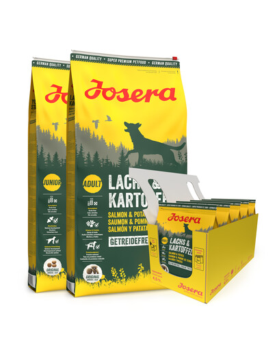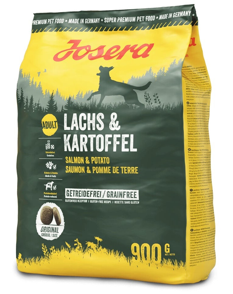Zloženie: sušené zemiaky 51%, sušený losos 19%, hydinový tuk, repná dužina, zemiakový proteín, svätojánsky chlieb, hydrolyzovaný rybí proteín, minerálne látky, sušený koreň čakanky (prírodný zdroj inulínu), bylinky, ovocie