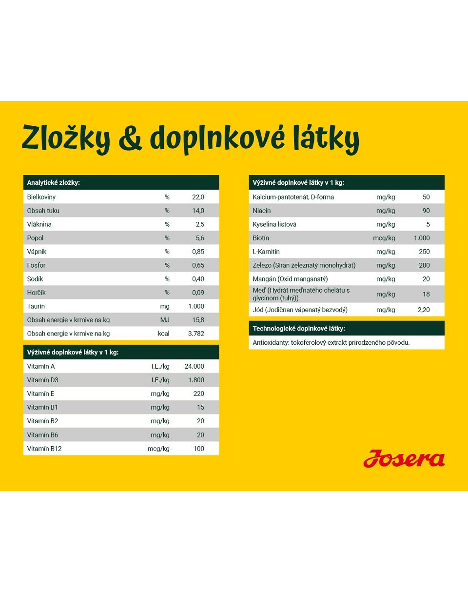 Proteín: 22%, tuk: 14%, surová vláknina: 2,5%, popol: 5,6%, vápnik: 0,85%, fosfor: 0,65%