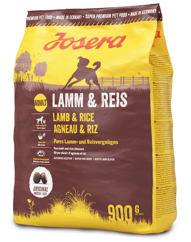 Jahňacia múčka 25,00%, ryža 25%, kukurica, kukuričná múčka, repa, hydinový tuk, hrachový škrob, droždie, kukuričný proteín, minerály, svätojánsky chlieb