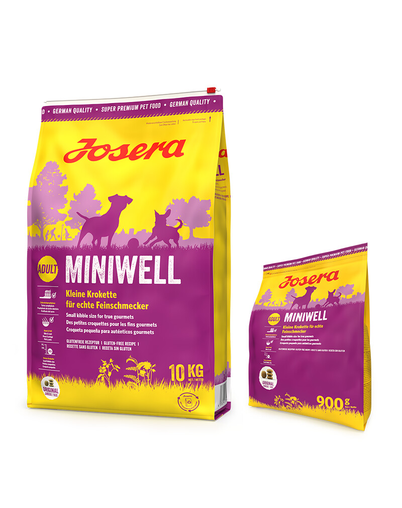 Kompletné krmivo Josera Miniwell s intenzívnou chuťou pre psov malých plemien. Receptúra s obsahom vitálnych látok, vďaka ktorým granule redukujú riziko tvorby zubného kameňa. Bez umelých farbív, aróm, konzervačných látok a GMO. Granule pre skutočné malé psích labužníkov balené do praktického znovu uzatvárateľného vrecka, pre zachovanie cenných vlastností.