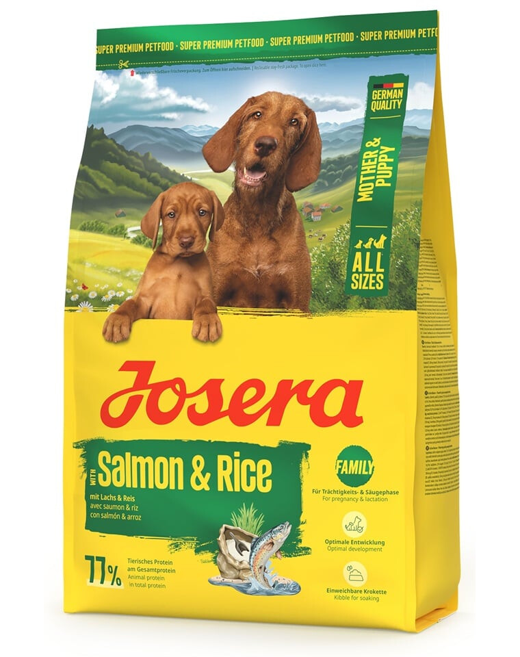 Kompletné, vysoko kvalitné chovateľské krmivo vyvinuté špeciálne pre sučky v tehotenstve, dojčiace matky a rastúce šteňatá do 8. týždňa života. JOSERA Mother & Puppy Salmon with Rice je jemné, bezlepkové krmivo s lososom a ryžou, ktoré poskytuje všetky potrebné živiny podporujúce zdravý vývoj mladých psov a kondíciu ich matiek v náročnom období tehotenstva a laktácie.