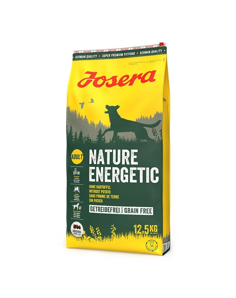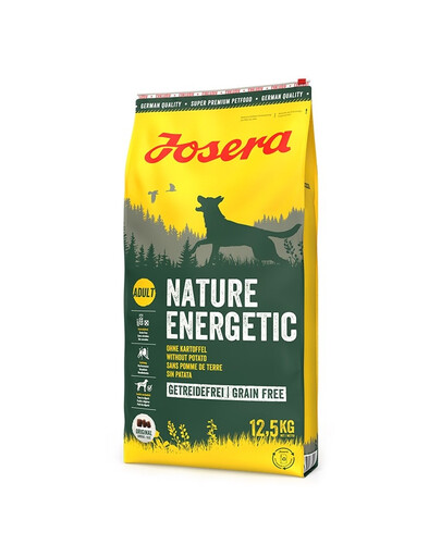 Krmivo Josera Nature Energetic dodáva organizmu aktívnych psov dostatok bielkovín a sacharidov - a to všetko bez obilnín. Toto krmivo je tak vhodné i pre citlivých psov s citlivým trávením alebo trpiacimi alergiami. Vyvážená receptúra obsahuje veľké množstvo ľahko stráviteľného hydinového mäsa a sladkých zemiakov. L-karnitín povzbudzuje látkovú výmenu a ovplyvňuje zásobu energie behom telesnej aktivity. Pri zvýšenej aktivite a vysokých športových výkonoch sa v tele tvoria voľné radikály. Ich škodlivé účinky môže zmierniť vitamín E. Slávka zelenoústa zvyšuje pohyblivosť kĺbov.