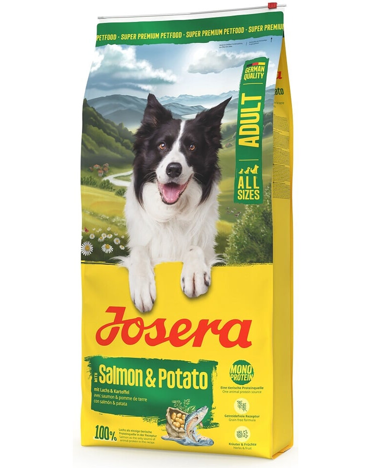 Josera Salmon & Potato je výnimočné suché krmivo vytvorené špeciálne pre dospelých psov s citlivým žalúdkom. Receptúra založená na jednom zdroji živočíšnych proteínov – lososovi, robí krmivo obzvlášť dobre tolerované. Losos nielenže poskytuje psovi plnohodnotné proteíny, ale tiež predstavuje bohatý zdroj omega-3 mastných kyselín, ktoré podporujú zdravú pokožku a lesklú srsť.