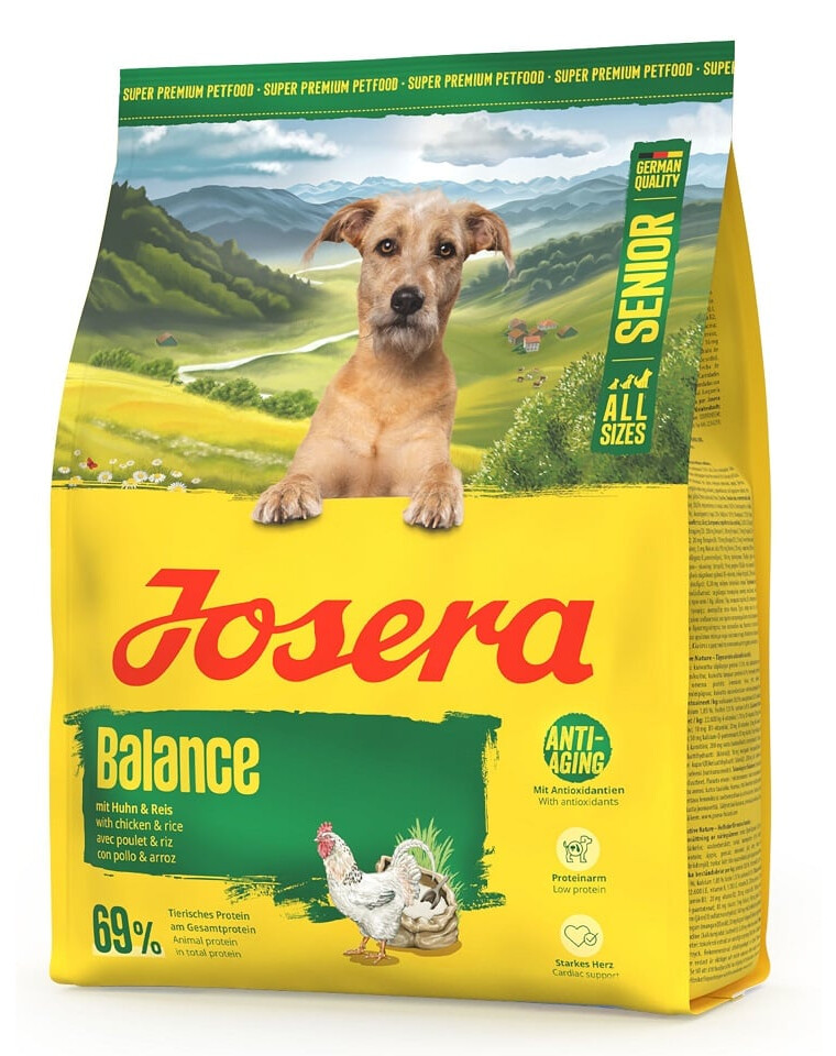 Prispôsobené potrebám starších psov: Josera Balance je špeciálne krmivo pre väčšiu vitalitu v staršom veku. Znížený obsah tuku a proteínu pomáha znižovať zaťaženie metabolizmu psa. Dobre tolerovaná a vyvážená formula neobsahuje lepok a môže pôsobiť proti starnutiu buniek vďaka cenným antioxidantom, ako sú vitamíny E a C a taurín. Keďže Balance je tiež krmivo pre psov s nízkym obsahom fosforu, môže tiež odľahčiť orgány v staršom veku. Vzhľadom na svoj špeciálny zloženie, nízkotučné krmivo pre psov môže byť tiež dobre tolerovanou alternatívou pre menej aktívne psy, ktoré ešte nedosiahli vek seniora. Aby bolo krmivo chutné, jeho receptúra obsahuje chutné kuracie mäso a ryžu.