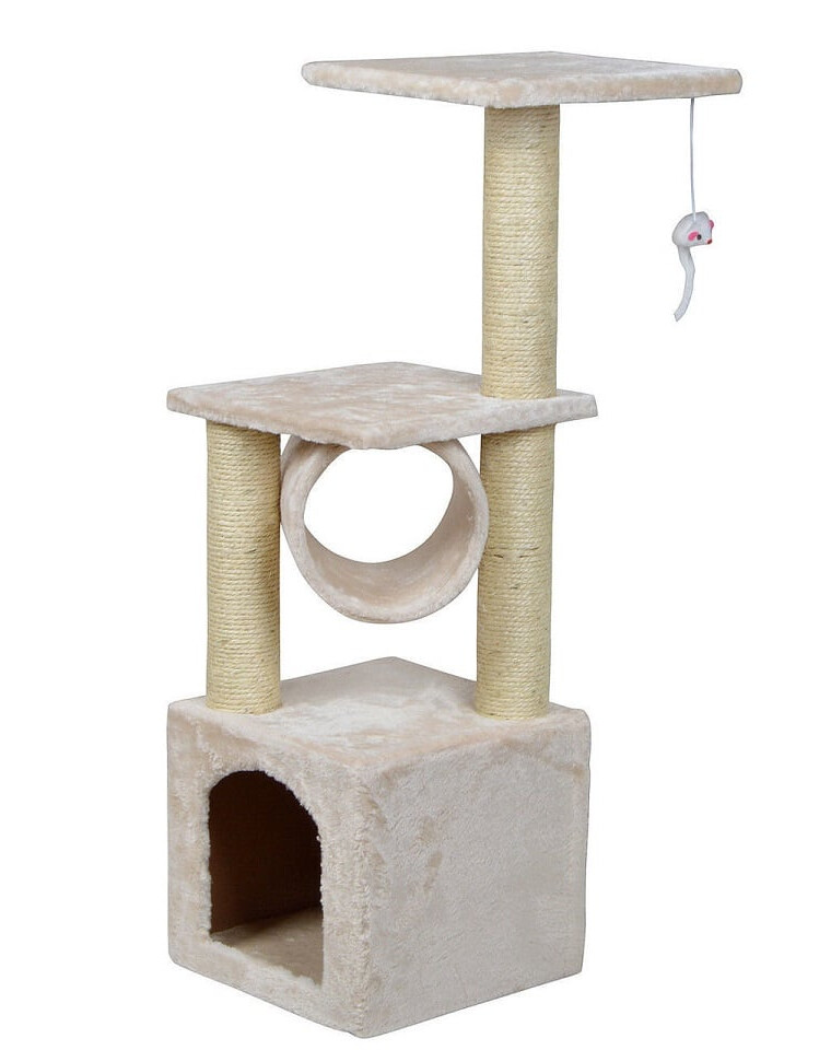 Škrabadlo má dve plošiny na šplhanie a odpočinok. Skvelé pre mačky všetkých vekových kategórií, ale najmä pre mačiatka túžiace po lezení a hre. Výška škrabadiel bude ideálna aj pre mačiatka, aby sa mohli natiahnuť. Na konci vyššej plošiny je zavesená myš pre ešte väčšiu zábavu a na spodnej plošine je tunel, ktorý sa dá použiť aj ako pelech.
