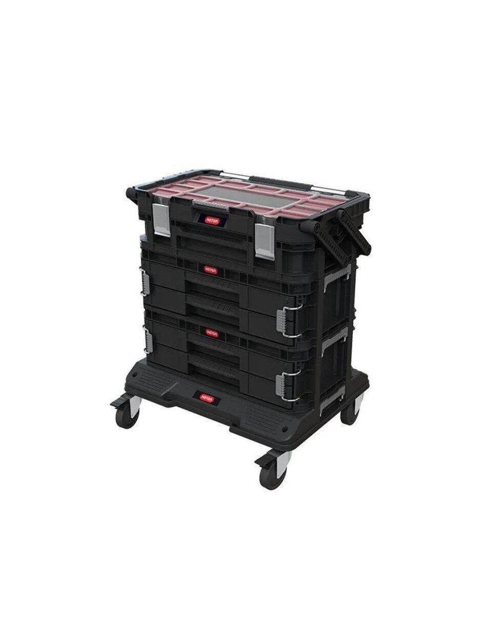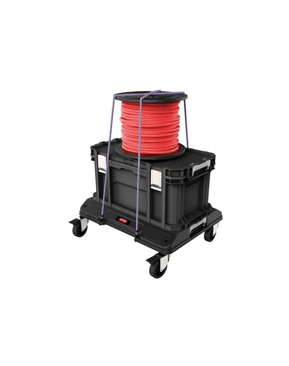 S dielenským zásobníkom Connect bude vaše vybavenie pre domácich majstrov mobilné a organizované! Plošina je ľahká a odolná a je navrhnutá na efektívnu prepravu náradia a príslušenstva s hmotnosťou až 100 kg. Či už sa rozhodnete uložiť skrinky a organizéry na náradie Connect, prepravovať stavebný materiál alebo naložiť 18-litrové vedrá na betón, tento vozík si poradí! Gumené kolieska uľahčujú jeho prepravu a špeciálne brzdy zaisťujú kolesá na mieste.