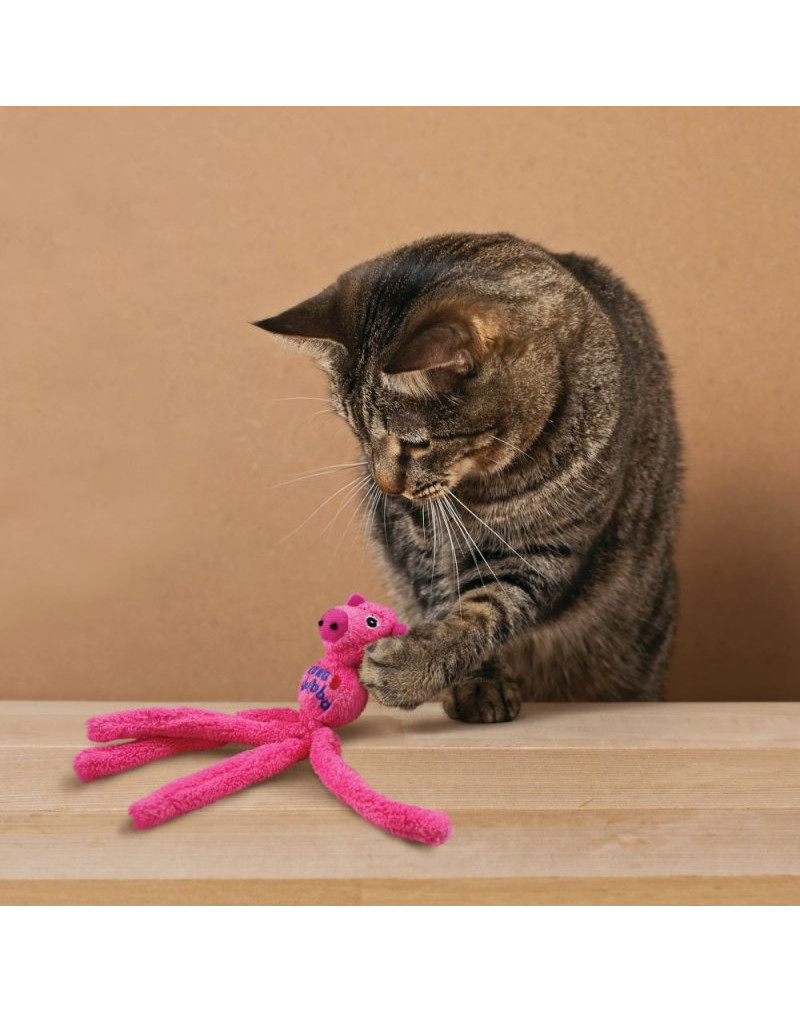Plyšová hračka naplnená catnipom, dlhé zvlnené chvosty a hrkálka.