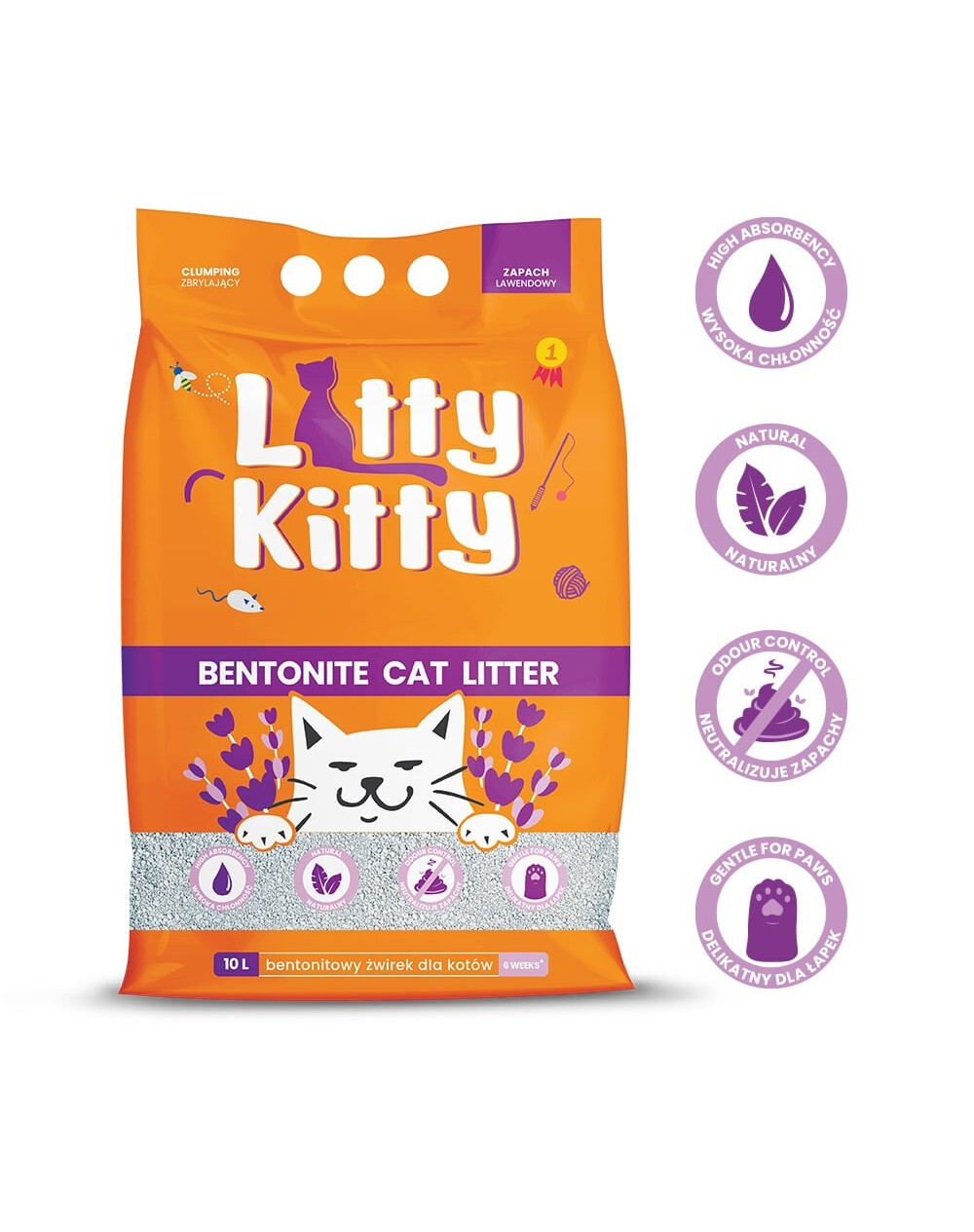 Bentonit Litty Kitty je účinná a absorpčná prírodná hlinená podstielka, ktorá sa po navlhčení zhlukuje do ľahko odstrániteľných hrudiek - jedno balenie vydrží až 6 týždňov používania*.
