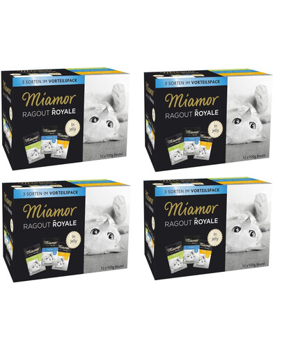 Miamor Ragout Royales Jelly 12×100 g kompletné krmivo, sortiment: králik, tuniak a kura. Ľahko stráviteľné kúsky mäsa v lahodnom želé pre dospelé mačky. Kompletné krmivo, jedlo obsahuje všetko, čo vaša mačka potrebuje. Vyrobené výrobným procesom, ktorý zachováva výživovú hodnotu a vitamíny surovín, takže priemyselné vitamíny sa pridávajú s mierou. Neobsahuje hovädzie mäso, farbivá ani konzervačné látky.