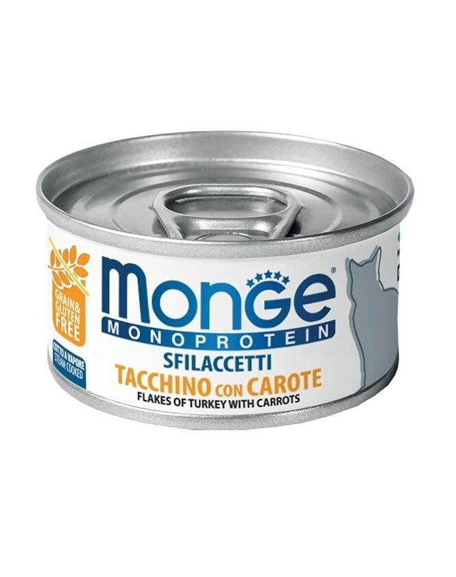 Monge Monoprotein konzerva pre mačky s jediným zdrojom bielkovín - morčacieho mäsa - a prídavkom mrkvy.