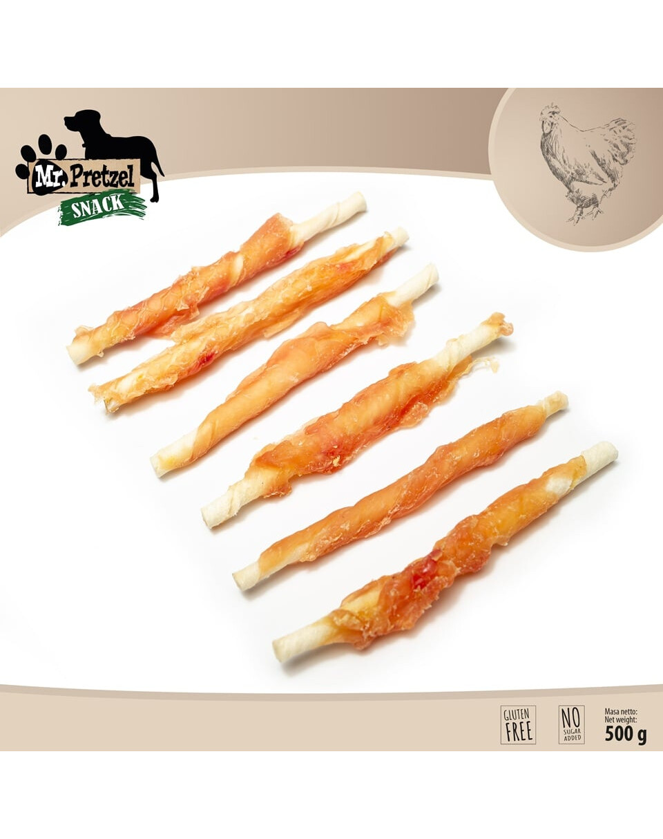 Prírodná tyčinka obalená mäsom z kurčaťa značky Mr. Pretzel je vynikajúca voľba pre psov, ktorí milujú žuť a hryzť.
