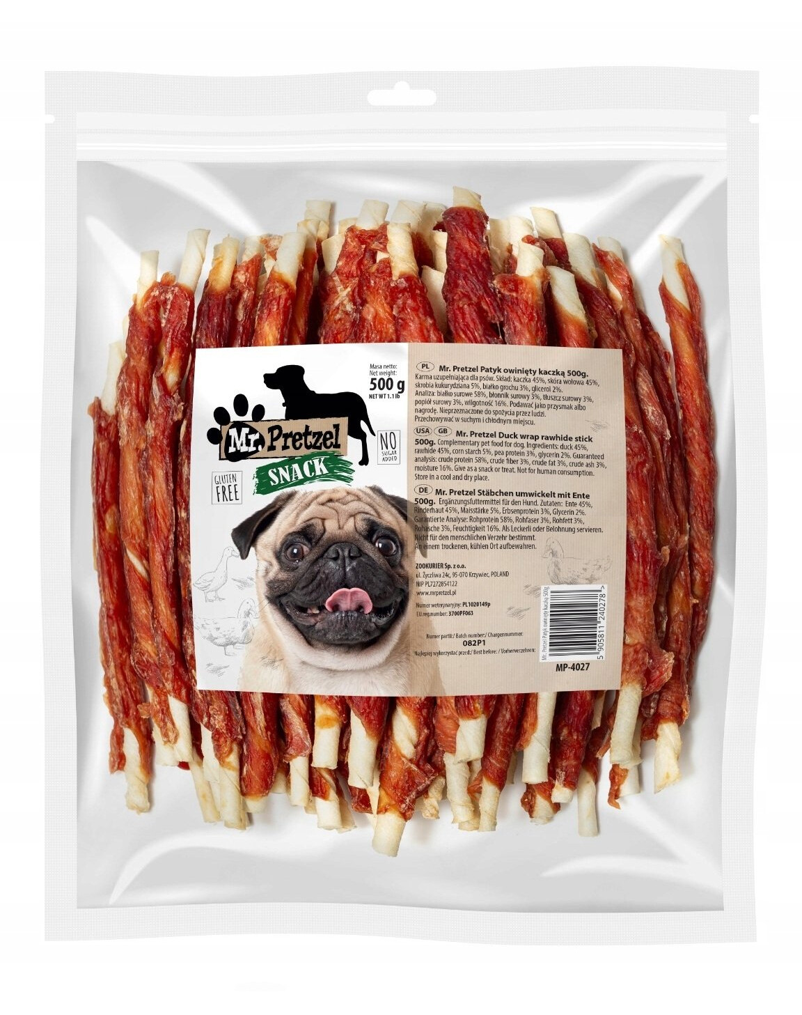 PREMIUM – Mr. Pretzel Tyčinka obalená kačacím mäsom je prémiová, mimoriadne chutná a kvalitná mäsová maškrta určená pre psy všetkých vekových kategórií. Rad pochúťok Mr. Pretzel vám umožňuje rozmaznávať vášho psa zdravou, funkčnou a praktickou odmenou.