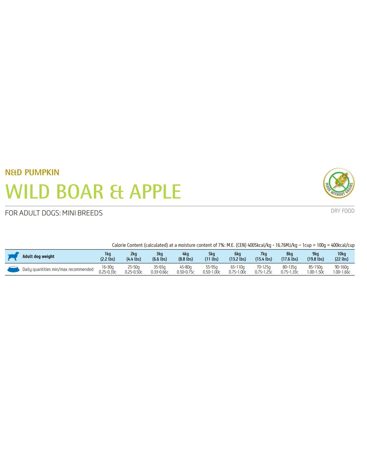 Čerstvé mäso z diviakov (24%), sušené mäso z diviakov (22%), hrachový škrob, kuracie tuk, sušené tekvice (5%), sušené celé vajcia, rybí olej (zo sleďov), hrachová vláknina, sušená mrkva, sušená lucerna, inulín, fruktooligosacharidy, kvasnicový extrakt (zdroj mannanoligosacharidov), sušené jablko (0,5%), sušený špenát, psyllium (0,3%), sušené granátové jablko, sušená sladká pomaranč, sušené čučoriedky, chlorid sodný, sušené kvasnice, koreň kurkuma (0,2%), glukozamín, chondroitín sulfát.