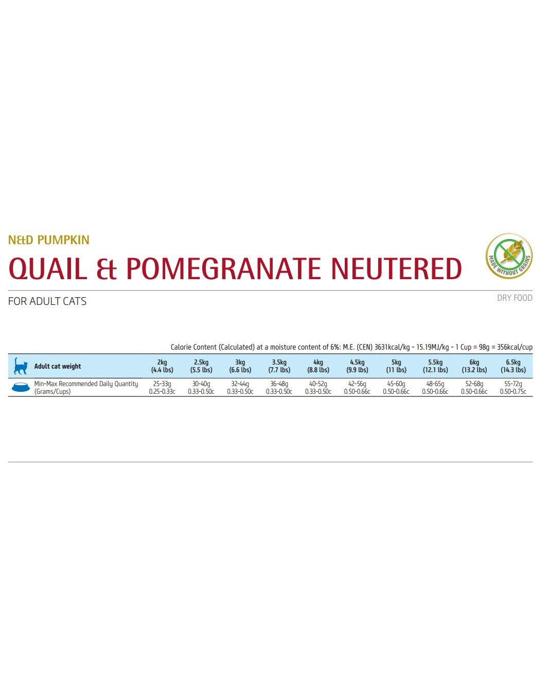 Čerstvé prepeličné mäso (32%), sušené prepeličné mäso (30%), hrachový škrob, sušená tekvica (5%), sušené celé vajcia, kuracie mäso, čerstvé sleďové mäso, sušené sleďové mäso, rybí olej (z sleď), sušená mrkva, sušená lucerna, inulín, fruktooligosacharidy, kvasnicový extrakt (zdroj mannanoligosacharidov), sušené granátové jablko (0,5%), sušené jablko, sušený špenát, psyllium (0,3%), sušená sladká pomaranč, sušené čučoriedky, chlorid sodný , sušené kvasnice na pivo, kurkuma (0,2%), glukozamín, chondroitín sulfát.
