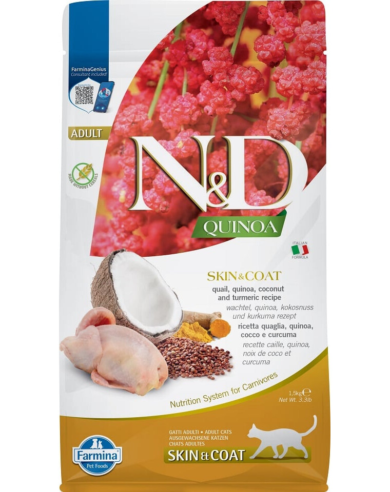 Prepelica, quinoa, kokos, kurkuma. Kompletné vyvážené krmivo pre dospelé mačky.