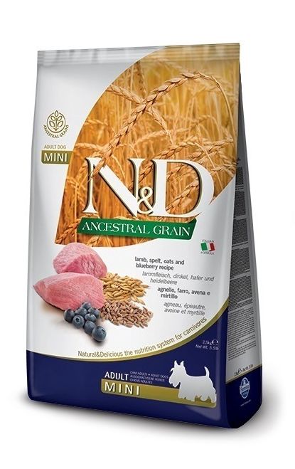 Farmina Ancestral Grain pre dospelé psy malých plemien je krmivo správne zložené z viacerých zložiek, ktoré spĺňajú všetky nutričné požiadavky. Krmivo obsahuje minimum obilnín, minimum sacharidov, ktoré pochádzajú z ovocia a zeleniny, a ľahko stráviteľné živočíšne tuky. Základom krmiva je jahňacie mäso, vysokokvalitné červené mäso bohaté na bielkoviny z fariem na Sardínii. Mäso je bez antibiotík, hormónov a konzervačných látok. Dostatočné množstvo vitamínov a minerálov poskytuje starostlivo vybrané ovocie a zelenina. Zdrojom bielkovín sú čerstvé a nikdy nie mrazené vajcia. Hnedé ovocie obsahuje vitamíny a antioxidanty, ktoré bojujú proti starnutiu a srdcovým chorobám. Produkty radu N&D sú obohatené o byliny so špecifickými vlastnosťami, prídavok extraktu z nechtíka lekárskeho je zdrojom luteínu.