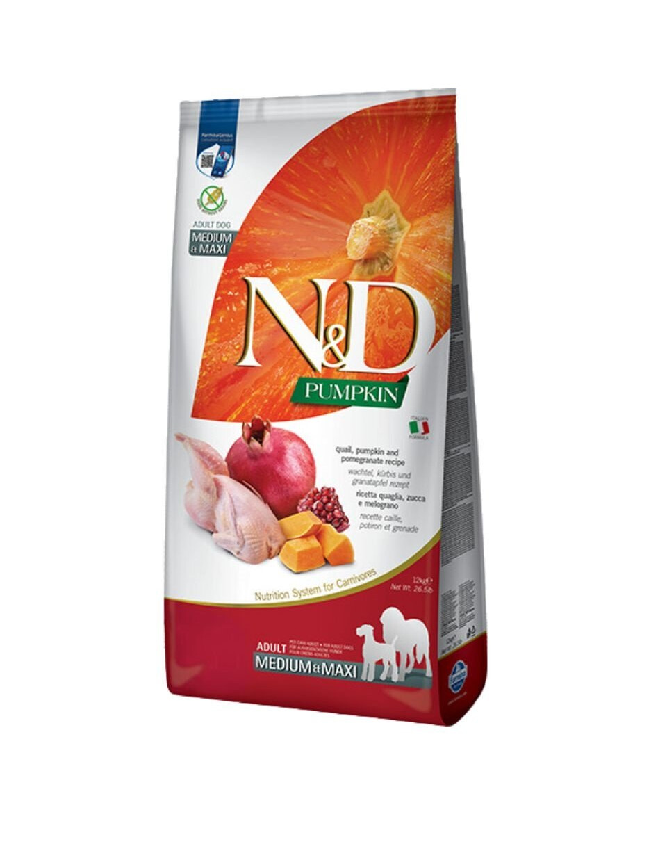 Kompletné krmivo pre dospelé psy s prepelicou, tekvicou a plodmi granátového jablka.