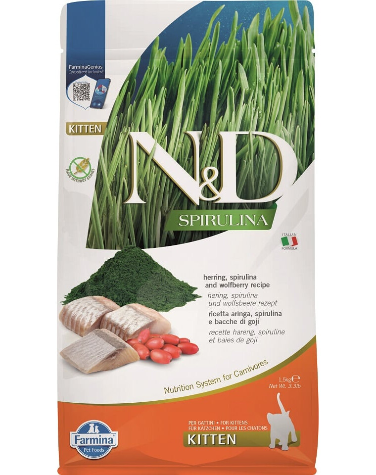 Kompletné krmivo pre mačiatka a gravidné a dojčiace mačky so sleďmi, spirulinou a plodmi goji.