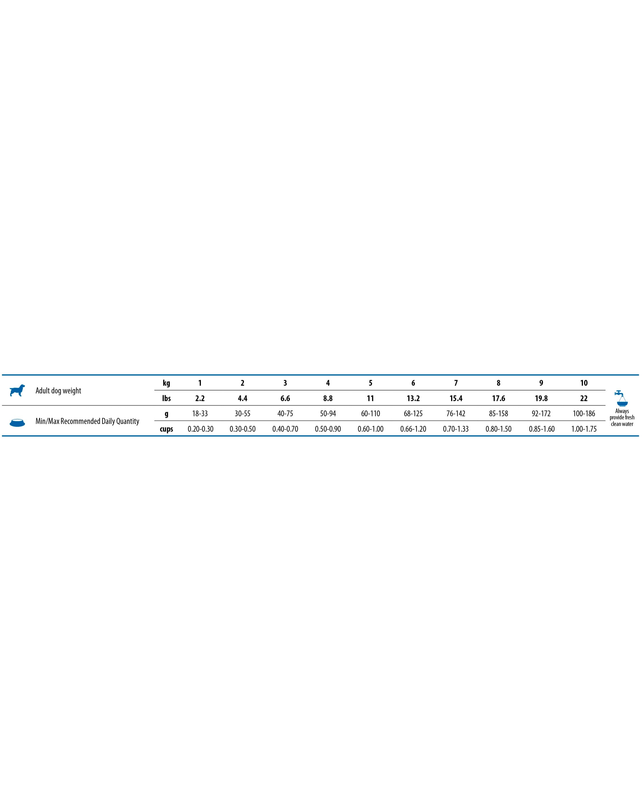 Hrubý proteín 23,00 %; hrubý tuk 18,00 %; hrubá vláknina 2,90 %; vlhkosť 9,00 %; hrubý popol 7,90 %; vápnik 0,90 %; fosfor 0,80 %; omega-6 1,60 %; omega-3 2,30 %; DHA 1,00 %; EPA 0,70 %; glukozamín 1200 mg/kg; chondroitín sulfát 900 mg/kg.
