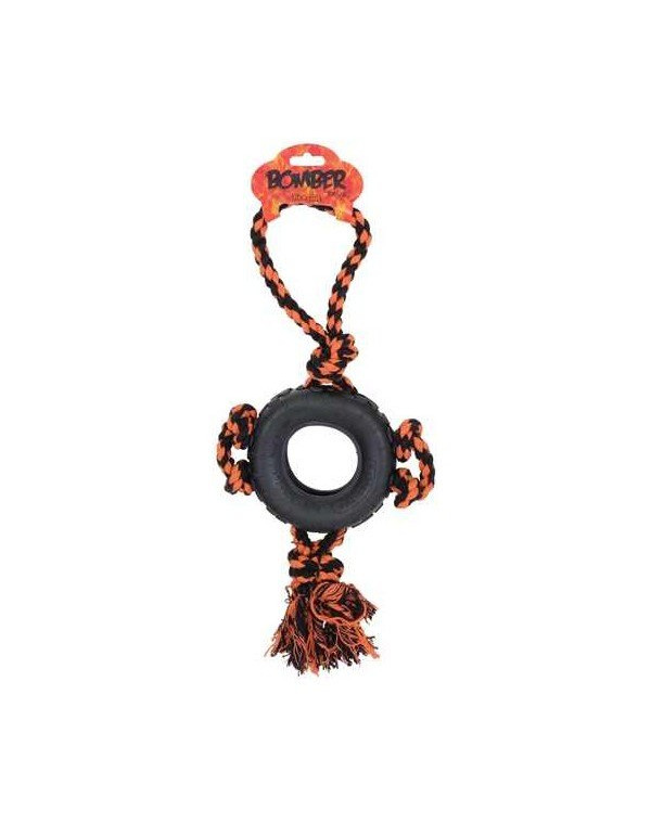 Hračka nás veľmi príjemne prekvapila, je slušne vyrobená a guma a šnúra sa zdajú byť robustné. Pneumatiku sme dostali v oranžovej farbe, čo nás veľmi teší, pretože táto farba je oveľa viditeľnejšia. V tráve sa ľahšie hľadá (horšie v jesennom lístí) a okrem toho máme radi farebné psie hračky (koberec posiaty pestrofarebnými kamienkami vyzerá oveľa zaujímavejšie). Bomber je pomerne ťažký, čo má svoje výhody aj nevýhody. Hmotnosť je pri hádzaní hračiek výhodou, pretože letia ďalej a dvaja z našich psov nemajú problémy s nosením ťažších vecí, nevýhodou je pre Coco, ktorá nemá rada ťažké a pomerne veľké hračky. Pneumatika sa vďaka šnúre hádže pomerne ľahko a jej let je nepredvídateľný. Musíte si len dávať pozor, aby ste ju nehodili na psa, pretože hračka je dosť ťažká.