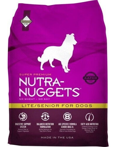 NUTRA NUGGETS Lite Senior je kompletné a plne vyvážené krmivo pre starších psov nad 7 rokov a pre psov s nadváhou. Toto jedinečné krmivo obsahuje prídavok glukosamínu a chondroitínu, ktoré sa starajú o správny stav kĺbov starších domácich zvierat.