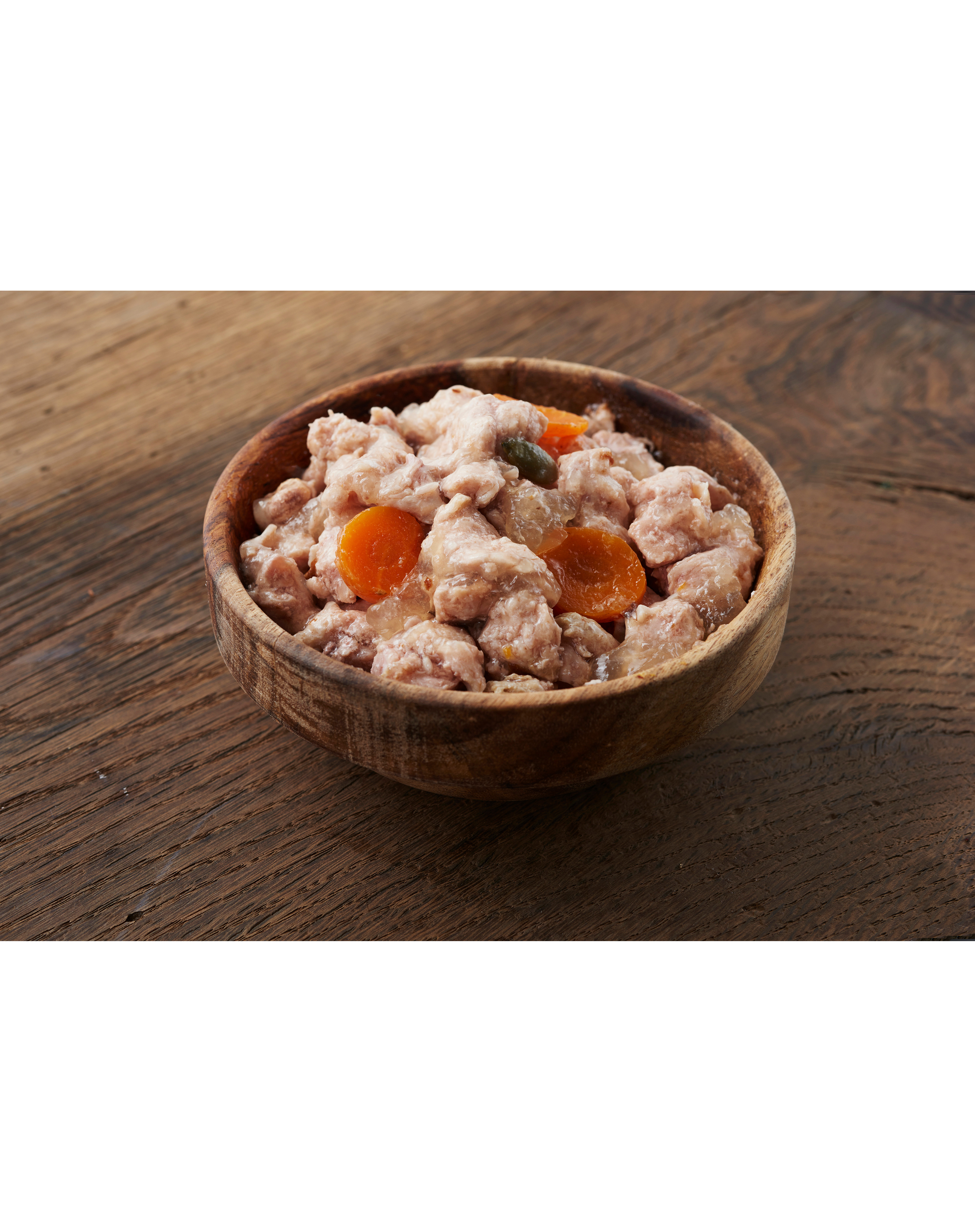 Mäso z morského mäsa minimálne 160 gramov v prírodnom mäse a zeleninovom vývare s tekvicovými semenami, mrkvou a sušenou slivkou (marhuľou)