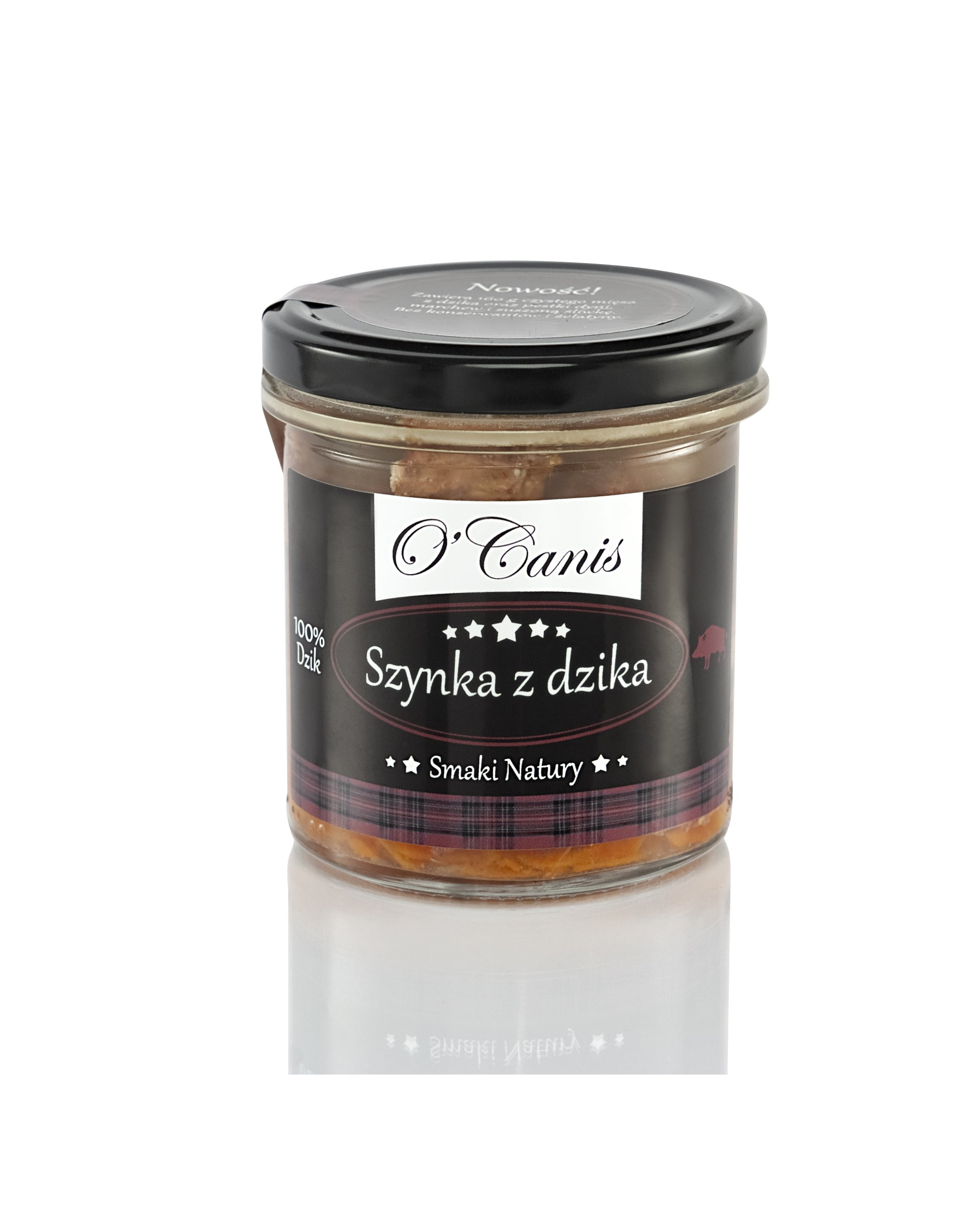 Doplnkové krmivo pre psa v sklnenom pohári. Obsahuje nakrájané kúsky diviaka na prírodnom vývare (vývare), tekvicové semienka, mrkvu a sušenú slivky. Žiadne konzervačné látky alebo želatína. Uchovávajte pri teplote do 20 ° C