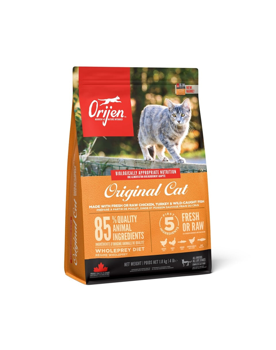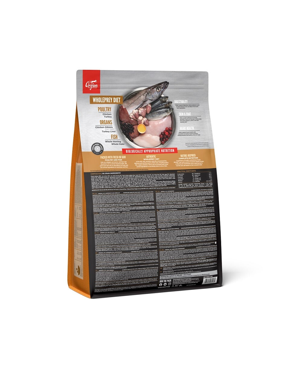 Sucha karma dla kotów i kociąt. Innowacyjna formuła stworzona przez specjalistów Orijen opiera się na produktach pochodzenia zwierzęcego bogatych w białko. Orijen Cat & Kitten to karma składająca się w 85% ze składników mięsnych. W ich skład wchodzą mięsa świeże i całe z kurczaka, indyka – ich wątróbek, oraz całych i świeżych ryb takich jak flądra i śledź. Uzupełnienie stanowią serca indycze i kurze. Pozostałe 15% składu to owoce i warzywa dobrane pod kątek uzyskania jak największej dawki witamin i substancji uzupełniających - marchew, jabłka czerwone, botwinkę, żurawinę, dynię w dwóch odmianach, gruszki oraz jagody. Specyficzny aromat zapewnia obecność lawendy oraz owoców dzikiej róży. Karma ma charakter uniwersalny czyli nadaje się do stosowania w przypadku kotów przebywających większość czasu w domu, jak również tych prowadzących aktywny tryb życia. Orijen nie zawiera zbóż, co jeszcze skuteczniej uwydatnia pokłady energii w codziennym funkcjonowaniu.
