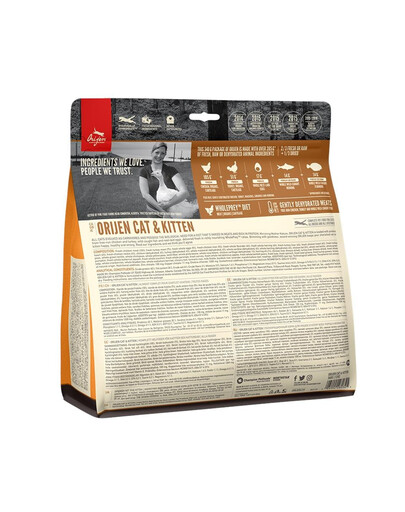 Sucha karma dla kotów i kociąt. Innowacyjna formuła stworzona przez specjalistów Orijen opiera się na produktach pochodzenia zwierzęcego bogatych w białko. Orijen Cat & Kitten to karma składająca się w 85% ze składników mięsnych. W ich skład wchodzą mięsa świeże i całe z kurczaka, indyka – ich wątróbek, oraz całych i świeżych ryb takich jak flądra i śledź. Uzupełnienie stanowią serca indycze i kurze. Pozostałe 15% składu to owoce i warzywa dobrane pod kątek uzyskania jak największej dawki witamin i substancji uzupełniających - marchew, jabłka czerwone, botwinkę, żurawinę, dynię w dwóch odmianach, gruszki oraz jagody. Specyficzny aromat zapewnia obecność lawendy oraz owoców dzikiej róży. Karma ma charakter uniwersalny czyli nadaje się do stosowania w przypadku kotów przebywających większość czasu w domu, jak również tych prowadzących aktywny tryb życia. Orijen nie zawiera zbóż, co jeszcze skuteczniej uwydatnia pokłady energii w codziennym funkcjonowaniu.
