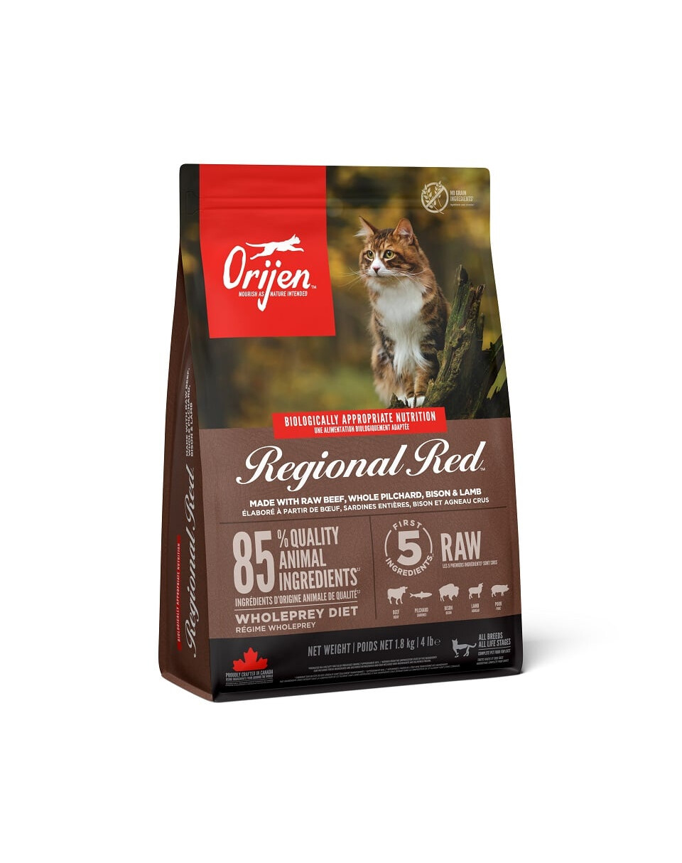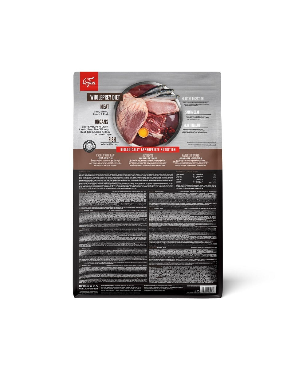 Je plné výživných bielkovín z ceneného hovädzieho mäsa Angus, bizóna, diviny, jahňacieho, ale aj drobov, voľne žijúcich rýb a podstielkových vajec. Suroviny sú dodávané denne čerstvé av pomere živín pridávané do krmiva. Receptúra má znížený obsah tuku a sacharidov a unikátnu zmes tekvicovej a jablčnej vlákniny na udržanie všetkých dospelých mačiek v špičkovej kondícii. Krmivo bolo vytvorené na základe stravy predkov mačiek a mnohoročného výskumu. Vysoký obsah živočíšnych bielkovín - 85% poskytuje najlepšie stráviteľné a najrýchlejšie vstrebateľné aminokyseliny a ďalšie živiny. 2/3 ingrediencií sú vhodné pre ľudskú spotrebu, krmivo je iba šetrne spracované, zatiaľ čo zvyšná 1/3 je dehydratovaná pri 90*.