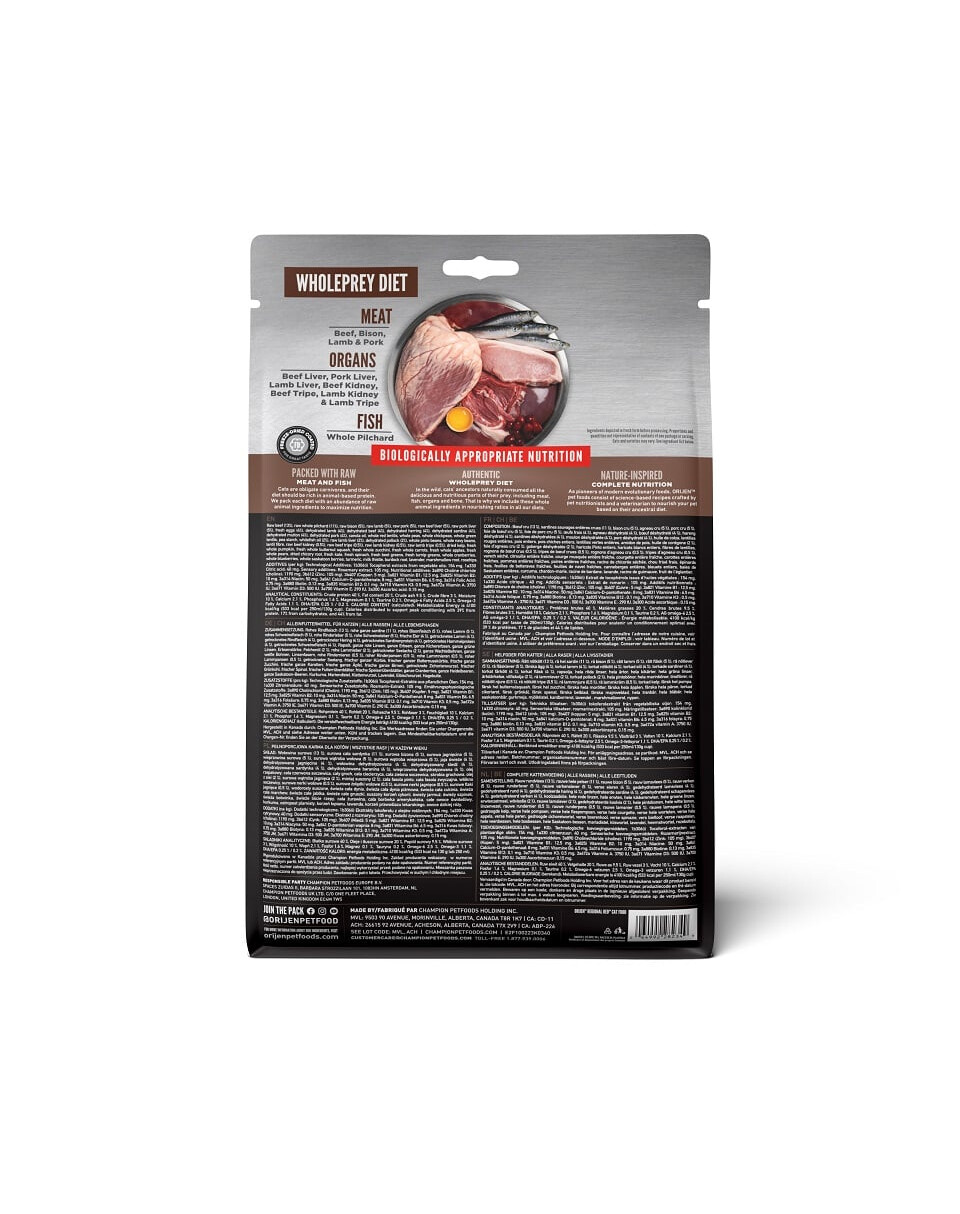 Je plné výživných bielkovín z ceneného hovädzieho mäsa Angus, bizóna, diviny, jahňacieho, ale aj drobov, voľne žijúcich rýb a podstielkových vajec. Suroviny sú dodávané denne čerstvé av pomere živín pridávané do krmiva. Receptúra má znížený obsah tuku a sacharidov a unikátnu zmes tekvicovej a jablčnej vlákniny na udržanie všetkých dospelých mačiek v špičkovej kondícii. Krmivo bolo vytvorené na základe stravy predkov mačiek a mnohoročného výskumu. Vysoký obsah živočíšnych bielkovín - 85% poskytuje najlepšie stráviteľné a najrýchlejšie vstrebateľné aminokyseliny a ďalšie živiny. 2/3 ingrediencií sú vhodné pre ľudskú spotrebu, krmivo je iba šetrne spracované, zatiaľ čo zvyšná 1/3 je dehydratovaná pri 90*.