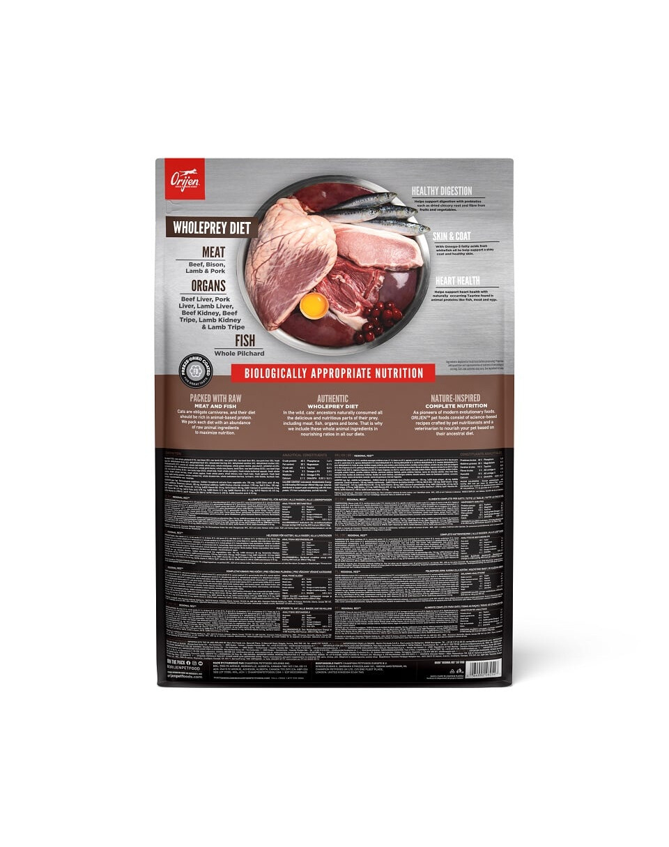 Je plné výživných bielkovín z ceneného hovädzieho mäsa Angus, bizóna, diviny, jahňacieho, ale aj drobov, voľne žijúcich rýb a podstielkových vajec. Suroviny sú dodávané denne čerstvé av pomere živín pridávané do krmiva. Receptúra má znížený obsah tuku a sacharidov a unikátnu zmes tekvicovej a jablčnej vlákniny na udržanie všetkých dospelých mačiek v špičkovej kondícii. Krmivo bolo vytvorené na základe stravy predkov mačiek a mnohoročného výskumu. Vysoký obsah živočíšnych bielkovín - 85% poskytuje najlepšie stráviteľné a najrýchlejšie vstrebateľné aminokyseliny a ďalšie živiny. 2/3 ingrediencií sú vhodné pre ľudskú spotrebu, krmivo je iba šetrne spracované, zatiaľ čo zvyšná 1/3 je dehydratovaná pri 90*.