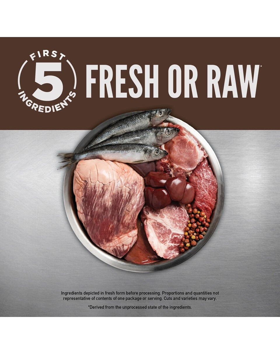 Zloženie: Surové hovädzie mäso (13 %), surové celé sardinky (11 %), surový bizón (5 %), surové jahňacie mäso (5 %), surové bravčové mäso (5 %), surová hovädzia pečeň (5 %), surová bravčová mäsa ( (4 %), sušený sleď (4 %), sušená sardinka (4 %), sušená sardinka 4 %) , dehydrované jahňacie (4 %), dehydrované jahňacie mäso (4 %), repkový olej, celá červená šošovka, celý hrášok, celý cícer, celá zelená šošovka, 2 %), sušená treska (2 %), celá fazuľa pinto, celá fazuľa, šošovicová vláknina, surová oblička hovädzie mäso (0,5 %), surové hovädzie držky (0,5 %), surové jahňacie obličky (0,5 %), surové jahňacie držky (0,5 %), sušené morské riasy, čerstvá celá tekvica, čerstvá celá cuketa, čerstvá celá mrkva, čerstvá celá jablká, čerstvé celé hrušky, sušený koreň bobule skatoon, kurkuma, pestrec mariánsky, koreň lopúcha, levanduľa, koreň proskurníku, šípky.