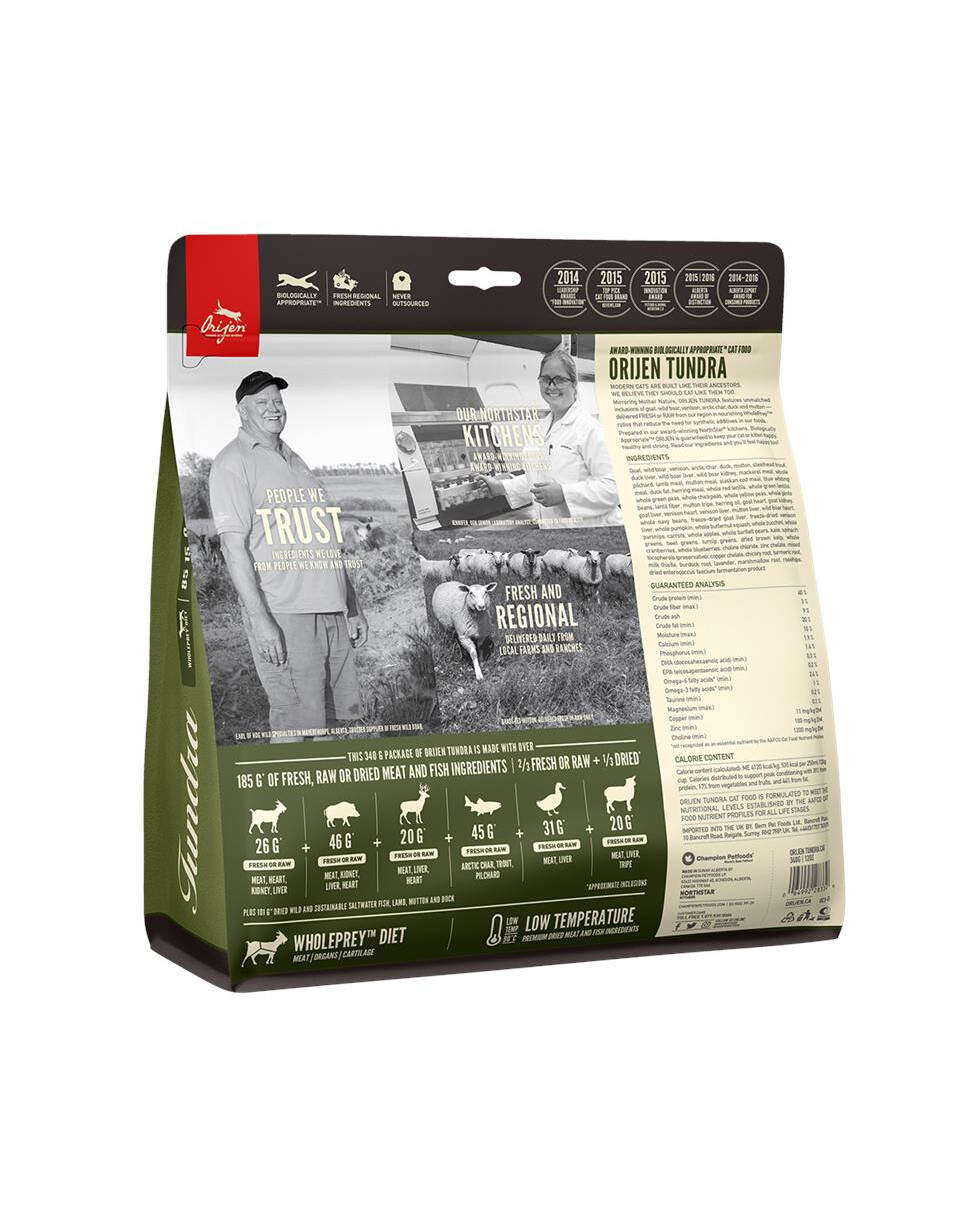 Orijen Tundra Cat je krmivo pre mačky pozostávajúce z 8 vybraných a čerstvých hlavných surovín. Čerstvé kozie mäso, jelenie, baranie, kačacie, prepeličie, pstruhové, wapiti z voľného chovu a vnútornosti. Hlavné produkty majú regionálny charakter - sú získavané iba z dôveryhodných miestnych fariem bez prísad konzervačných látok a antibiotík. Jedlo navyše obsahuje veľa zeleniny a ovocia - tekvica, cuketa, mrkva, jablká a hrušky. Šípky šíria chuť. Biologické potreby, ktoré sa vyskytujú v priebehu evolúcie, sú zrejmé, pretože vyplývajú zo skutočnosti, že optimálny dopyt je na úrovni 40% bielkovín a 18% sacharidov, čo telu dodáva krmivo Orijen Tundra.