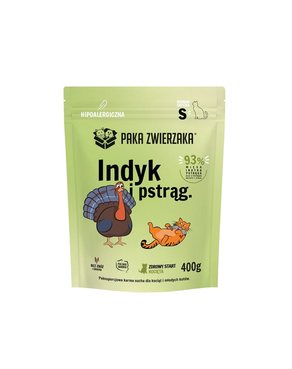 Paka Zwierzaka Morčacie s Pstruhom je komplexné výživové riešenie, ktoré zodpovedá potrebám mladých mačiek, zabezpečujúc im zdravý štart a správny vývoj bez zbytočných prídavkov.