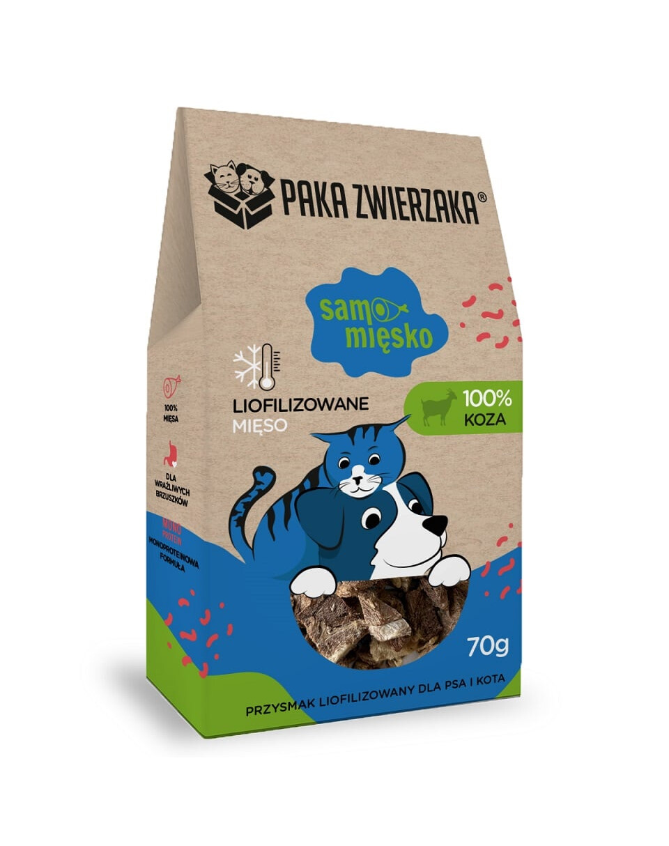 Samo Mäsko – 100% Koza je vysokokvalitná, monokomponentná maškrta pre psov a mačky, vyrobená výlučne z kozieho mäsa. Produkt neobsahuje konzervanty, farbivá, obilniny ani žiadne umelé prísady. Vďaka procesu lyofilizácie mäso zachováva svoje prirodzené nutričné vlastnosti, chuť a arómu, ktoré povzbudia aj najnáročnejšie zvieratá.
