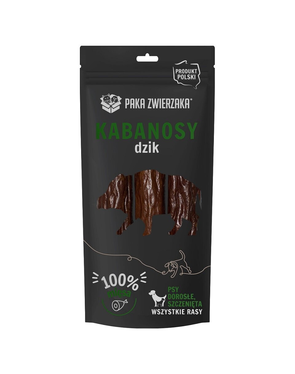 Chrumkavé, chutné kabanosy z mäsa diviakov. Vynikajúci, 100 % prírodný doplnok stravy psov všetkých veľkostí. Prídavok kolagénu podporuje správne fungovanie obehového a tráviaceho systému. Sušenie teplým vzduchom im dodáva mimoriadnu chrumkavosť a zachováva všetky cenné vitamíny a minerály. Pri žutí masíruje ďasná, čistí zubný kameň a uspokojuje potrebu žuť. Výrobok neobsahuje žiadne konzervačné látky, zvýrazňovače chuti, arómy ani plnidlá.