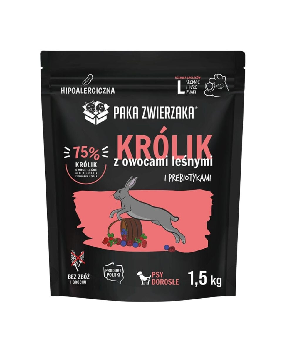 PAKA ZWIERZAKA Králik s lesnými plodmi „L” je kompletná suchá strava kvality SUPERPREMIUM, vyvinutá s ohľadom na psy veľkých plemien. Receptúra založená na vysoko kvalitnom mäse králika a prídavku lesných plodov, zeleniny a byliniek zabezpečuje vynikajúcu chuť a vysokú stráviteľnosť živín. Vďaka bezobilninovej formule sa krmivo osvedčí najmä u psov s citlivým tráviacim systémom alebo sklonmi k potravinovým alergiám.
