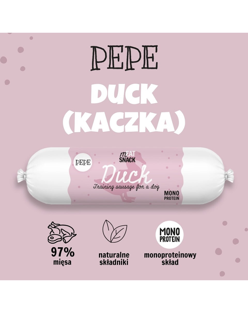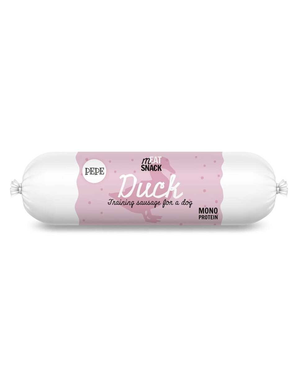 PEPE Meat Snack Kačacia klobása je dokonalým doplnkom stravy vášho psa! Obsahuje až 97 % kačacieho mäsa a 3 % bezlepkovej, ľahko stráviteľnej tapioky.