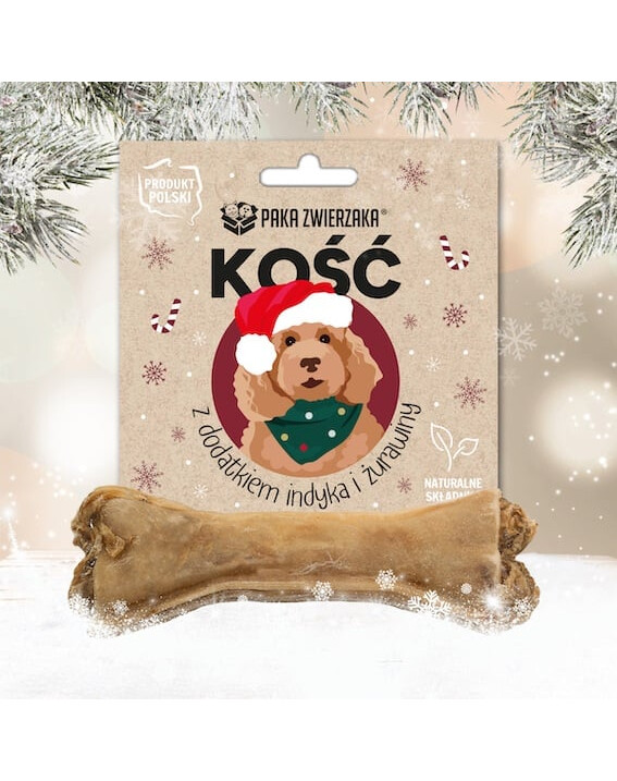 PAKA ZWIERZAKA Vianočná kosť s moriakom a brusnicou je ručne vyrábaný žuvací pamlsek z prírodných, kvalitných surovín. Výborne poslúži ako zdravá odmena aj ako zimný darček pre každého psa.