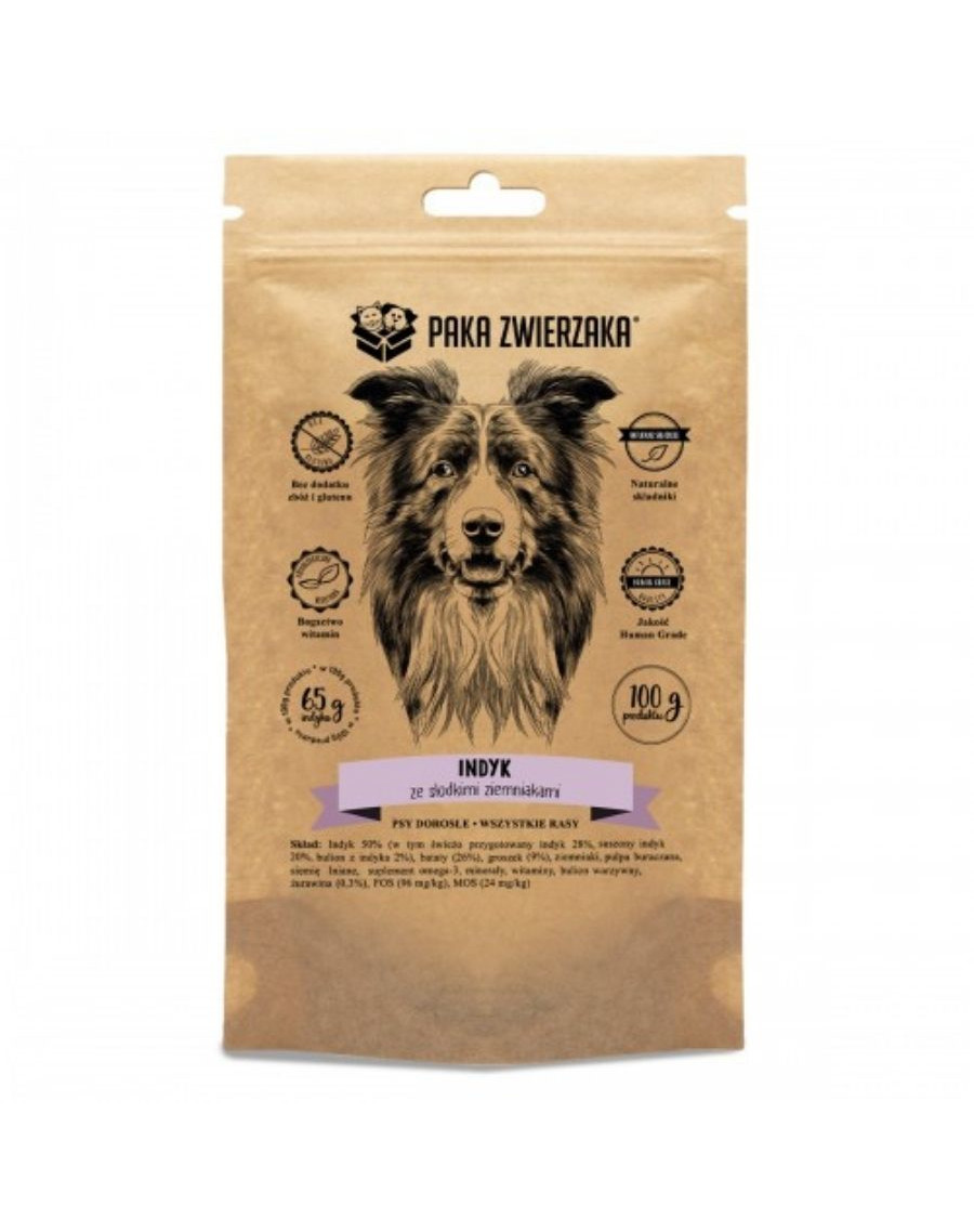 sušené morčacie mäso 20%, morčací vývar 2%), sladké zemiaky, hrášok (9%),