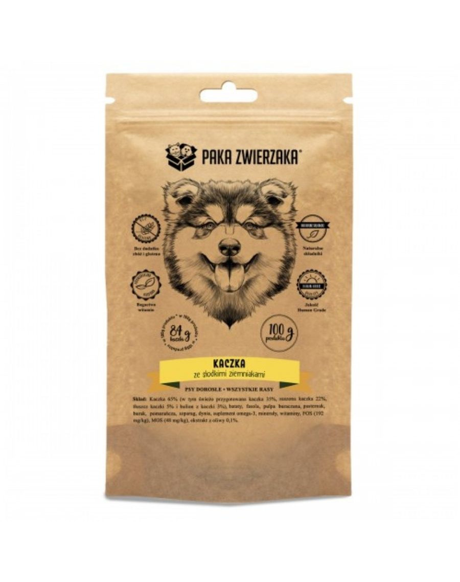 sušené kačacie mäso 22%, kačacia masť 5% a kačací vývar 3%), sladké zemiaky,