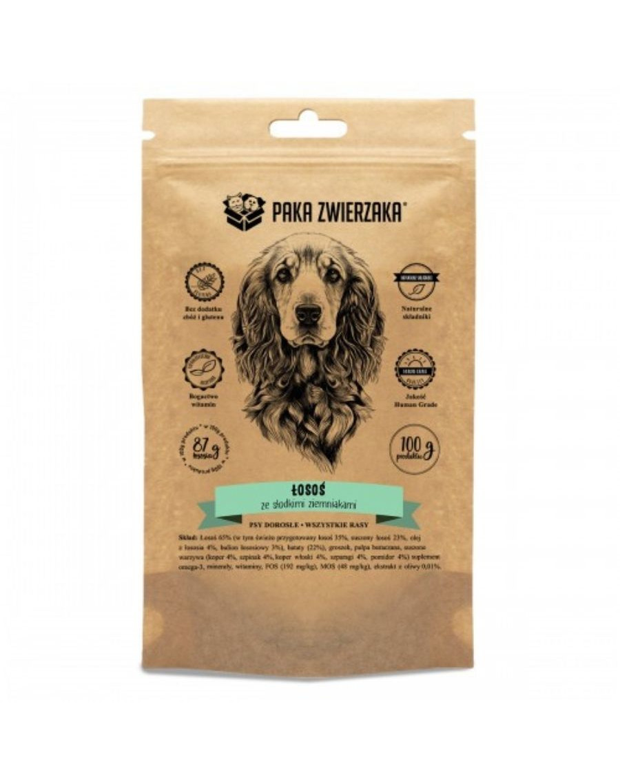 26 %, sušený losos 19 %, lososový olej 2,5 %, lososový vývar 2,5 %), sladké