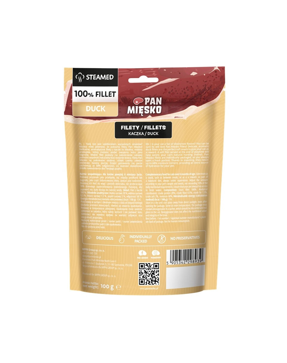 Tvoja mačka je milovníkom výrazných chutí? Môžeš si byť istý, že si zamiluje filety Pan Mięsko! Jemné, aromatické filety z kachny sú ideálna, mäkká pochúťka, ktorú môžeš svojmu mačkovi ponúknuť ako odmenu. Mäkký filet podávaný na konci hry pomôže uspokojiť prirodzený mačací inštinkt lovca. Filety Pan Mięsko sú balené jednotlivo, takže vždy otváraš čerstvú porciu. Vďaka pareniu si zachovávajú až 68% vlhkosti, čo predstavuje dodatočný zdroj hydratácie pre tvojho miláčika.