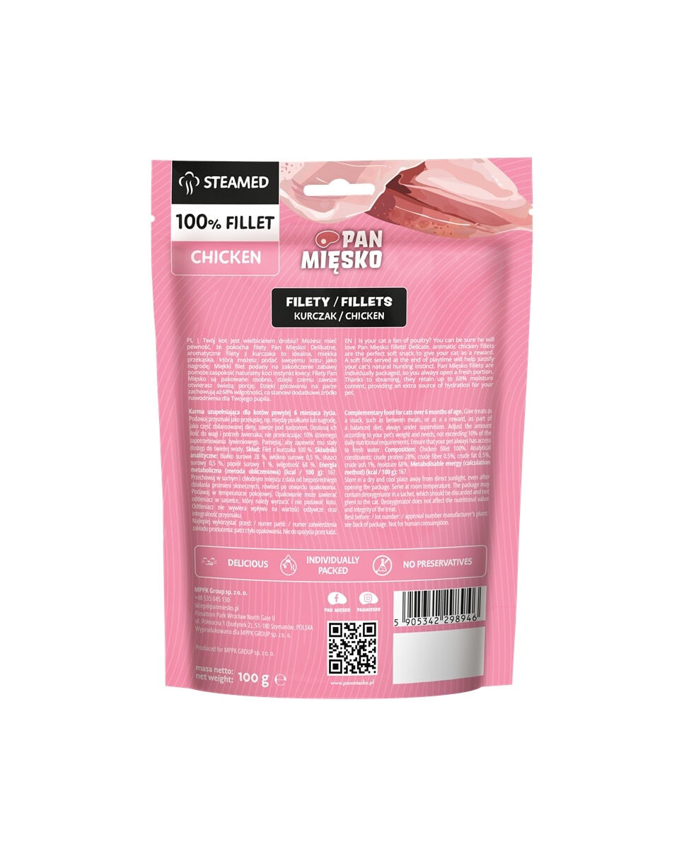 Váš kocúr je milovníkom výrazných chutí? Môžete si byť istí, že si zamiluje filety Pan Mięsko! Jemné, aromatické filety z kurčaťa sú ideálna, mäkká pochúťka, ktorú môžete svojmu mačkovi ponúknuť ako odmenu. Mäkký filet podávaný na konci hry pomôže uspokojiť prirodzený mačací inštinkt lovca. Filety Pan Mięsko sú balené osobitne, takže vždy otvárate čerstvú porciu. Vďaka vareniu na pare si zachovávajú až 68% vlhkosti, čo predstavuje ďalší zdroj hydratácie pre vášho miláčika.