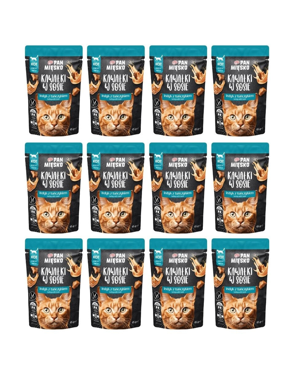 ZLOŽENIE: morčacie 71 % v rozdrobených kúskoch* (mäso 27 %, srdcia, žalúdky, pečeň), tuniak 8 % v rozdrobených kúskoch*, hovädzie bielkoviny 3 %, škrob z tapioky, minerálne látky, sušené brusnice 0,2 %, lososový olej 0,2 %, sušené pivovarské kvasnice 0,2 %, bazalka 0,1 %. *Kúsky tvoria 52 % hotového produktu.