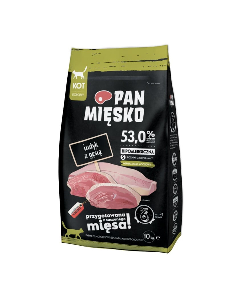 Zoznámte sa s hypoalergénnym krmivom pre mačky Pan Mięsko. Vyznačujú sa starostlivo vybraným mäsom so šťavnatými jablkami, zdravou zeleninou a cennými živinami, ktoré pozitívne ovplyvnia zdravie a kondíciu vašej mačky. Naše recepty pripravili odborníci, aby vášmu štvornohému spoločníkovi poskytli presne to, čo potrebuje. Vaša mačka si zaslúži to najlepšie.