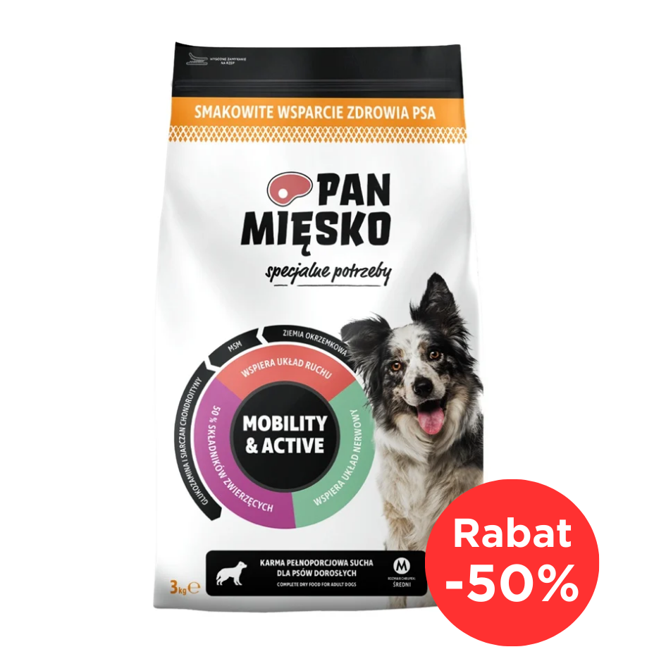 MOBILITY & ACTIVE je krmivo pre dospelé psy obsahujúce zložky podporujúce pohybový aparát, ako sú glukozamín, chondroitín sulfát alebo MSM, ako aj zložky podporujúce výkonnosť a správne fungovanie srdca a nervového systému: taurín a L-karnitín. Formula bola pripravená s ohľadom na aktívne, športové psy a psy, ktoré potrebujú podporu počas rekonvalescencie.